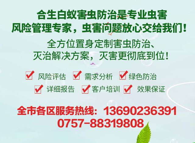 佛山市合生白蚁害虫防治公司是佛山市白蚁防治行业协会会员单位、佛山市鼠害与卫生害虫防治协会会员单位,随着本公司的规模不断壮大和服务质量不断提高,本公司已通过ISO国际质量管理体系认证,荣获“守合同,重信用”企业,是珠三角白蚁防治行业中知名的佛山白蚁防治、灭白蚁、杀白蚁、害虫防治服务商。